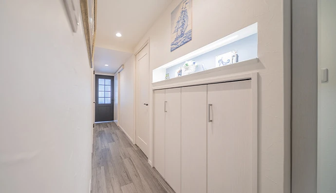 廊下には新たにニッチを設け、お気に入りの小物を飾れる楽しい空間に。玄関は姿見を取り付けたトール収納を新設。玄関回りの収納力は大幅に向上しました。