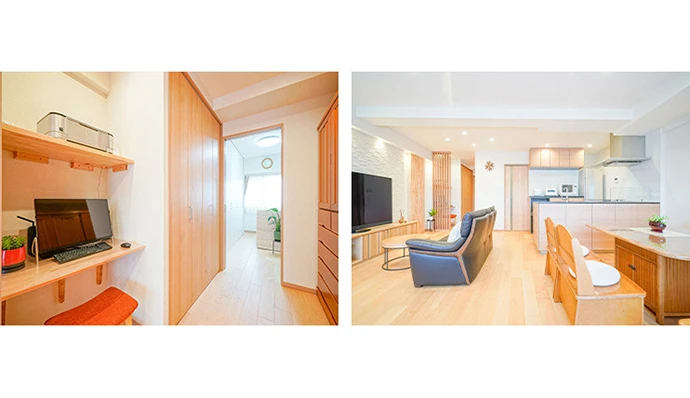 リビング・ダイニングには、洋室(1)につながる大きな収納スペースを確保。和室にあった奥さまのタンスを収め、お持ちの物がすっきりとしまえる収納とデスクも新設し、ご主人さまのワークスペースにもなる充実した空間としました。また、デスクのリビング側を縦格子にすることでリビングの光を採り込み、手元が明るくなるよう配慮しました。
