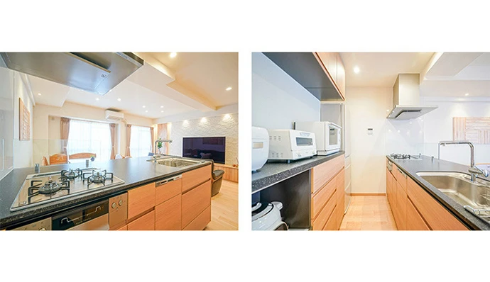 キッチンは、コンロ前面の壁をなくすことで、より明るく開放的に。リビング・ダイニングのテレビを見ながらのお料理も楽しめます。新調したシステムキッチンの天板と新設したカップボードの天板は、黒い人造大理石を採用しました。リビングのソファーと色調を合わせることで空間に統一感が生まれ、アクセントにもなっています。
