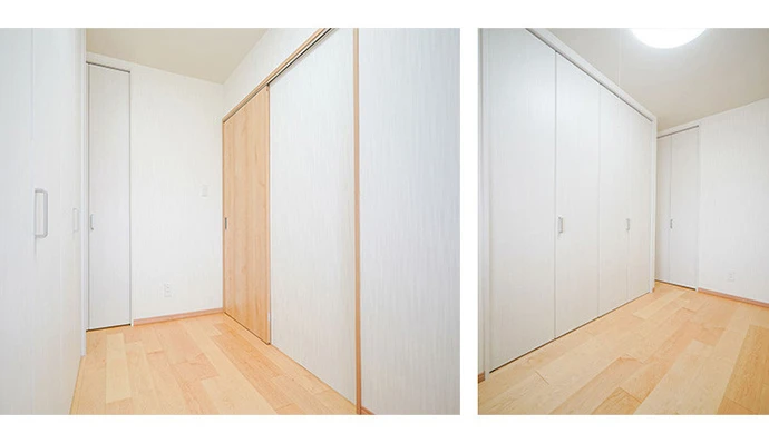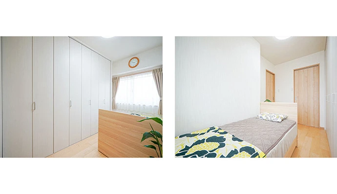 洋室(1)は、奥さまの寝室です。壁一面にクロゼットを新設し、たっぷりと収納できるようにしました。クロゼットの扉は折れ戸を採用することで、扉を左右に大きく開くことができ、出し入れがしやすくなるよう考慮しました。