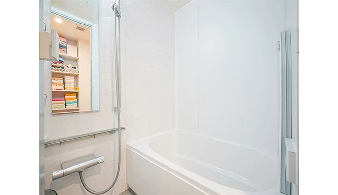洗面室は、洗面台の位置を変更し洗面スペースを広く確保することで、新しく大きな洗面化粧台を設置することができました。また、洗面化粧台の横には、入れる物に合わせて高さを変更できるよう、可動棚を設置しました。