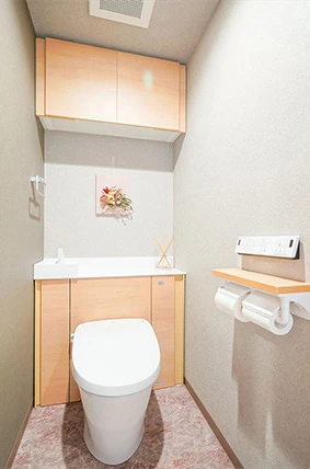 トイレは、ホコリが溜まりやすいタンクの後ろの部分をすべてキャビネットに隠すことで、お手入れがしやすくなりました。壁の片側1面にはグレーのアクセントクロスを採用し、吊戸棚やキャビネットなどのナチュラルな木調と柔らかく調和する空間としました。