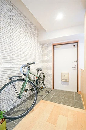 玄関は、お子さまからの贈り物の自転車をディスプレイできるよう土間を広げました。シート張りだった土間はタイル張りに変更し、壁は白い石目調のタイル張りに。玄関ドアの内側にも白いシートを張って、統一感のある空間になりました。また、洋室(2)の一部を玄関スペースに変更し、トールタイプの玄関収納を新たに設けました。