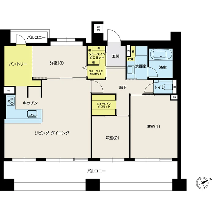 洋室(1)(2)それぞれにあったウォークインクロゼットを無くして、家族全員が使えるように廊下にウォークインクロゼットを配置しました。
