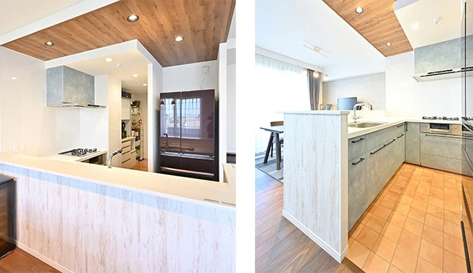 暗かった独立キッチンを風通しの良い対面キッチンにし、作業のしやすさを考えてL字型にしました。システムキッチンの面材は、奥さまお気に入りのグレーを採用。床は耐水性があり、衝撃にも強いクッションフロアを選びました。天井は床材や建具と同じ木目調のものを何点かご提案し、ご希望のものをお選びいただき、統一感を持たせることができました。
