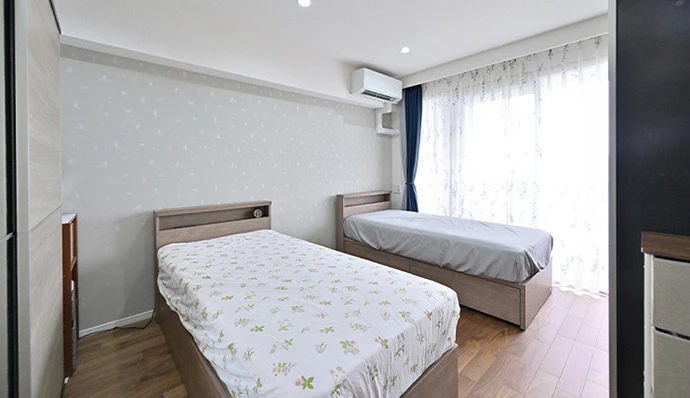 ご夫婦の寝室である洋室(1)はウォークインクロゼットをなくし、天井の高さも上げて、ゆとりある寝室としました。白を基調とした部屋に、淡いグリーンのアクセントクロスを採用し、落ち着いた空間を演出しています。奥さまが就寝されても、ご主人さまは読書をしてご自分の時間を過ごすなど、ご夫婦それぞれに使い分けられるよう、お部屋の照明のスイッチは2つに分けています。