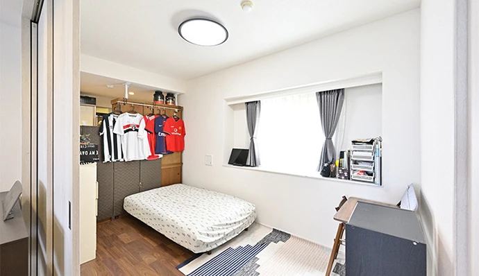 2つの子ども部屋のうちの一部屋である洋室(3)は、将来お子さまが独立されたときにリビング・ダイニングと一続きにできるよう、三枚扉を採用しました。さらにリビング・ダイニングを通らずに洋室(3)からもパントリーに行けるようご希望されていたので、パントリーとの境に壁を設けないプランをご提案しました。