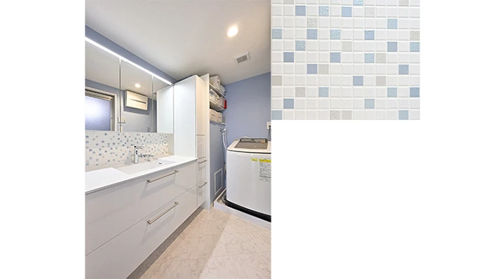 洗面室は、三面鏡タイプの洗面台に交換しました。ボールの背面にはお掃除がしやすい、奥さまお気に入りのモザイクシートを採用。扉があって使い勝手が悪かった洗濯機置き場側面の収納は、オープン棚にしたことで出し入れがしやすくなりました。