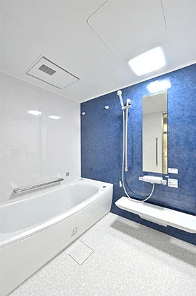 浴室は床まわりのきれいがつづく「床ワイパー洗浄(きれい除菌水)」※1機能がついたユニットバスを採用しました。モザイク調のブルーのアクセントパネルを設置し、明るく清潔感のある印象に。