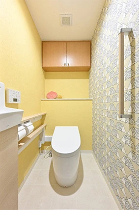 トイレはタンクレストイレを採用し、手洗いカウンターと手すりを新設しました。ハリネズミ柄のアクセントクロスで、明るくかわいらしい雰囲気になりました。