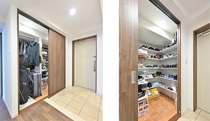 もともと廊下にあった収納を、玄関のシューズインクロゼットと合わせてひとつの大きなクロゼットとしました。引き戸に変更することで、中のものの出し入れがしやすくなりました。また、ゴルフバックなどの背の高い大きなものを収納できるスペースも確保しました。