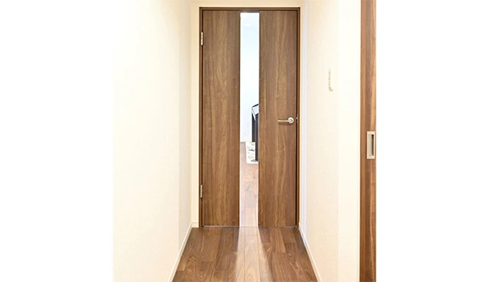 廊下とリビングを繋ぐ扉は、スリットから光を取り込めるデザインを採用しました。リビングの明かりが廊下にこぼれて、家族の気配を感じることができます。傷んでいた床は、落ち着いたウォールナットカラーの床材に新しくしました。