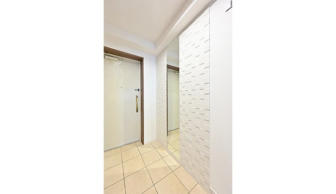 玄関の壁は調湿機能を持つエコカラット※1を採用し、さらに大きな姿見をアクセントに加えました。
