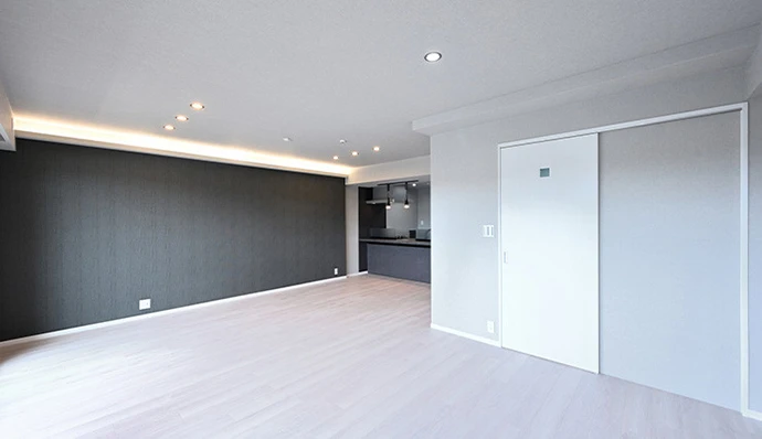 リビング・ダイニングの壁面にはブラック系のアクセントクロスを採用しシックな印象に。また梁を利用し折り上げて梁内に照明を設置。光を天井に当てる事で天井が高く感じられ柔らかい明るさで包んでくれる照明計画を施しました。