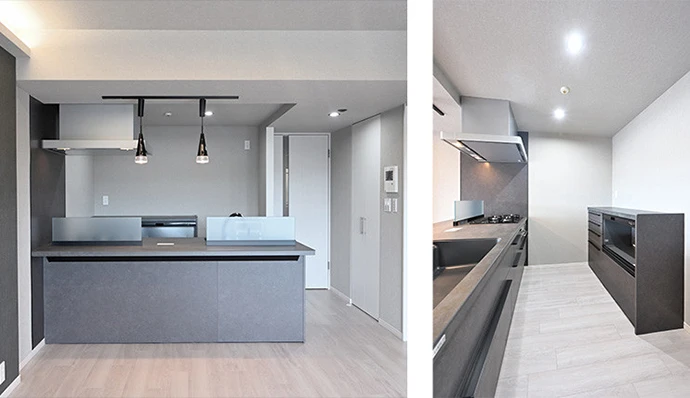 リビング・ダイニングに溶け込む空間にするため、システムキッチン、カップボード、キッチンパネルの色を合わせ濃いグレー色を採用しました。垂れ壁を撤去し閉鎖的だったキッチンをオープンな対面キッチンにする事で開放感溢れるキッチンに。熱、キズ、汚れに強く、美しいセラミックワークトップを採用してお手入れを簡単に。またワークトップの奥行を出しカウンター仕様にする事でハイチェアを置いて簡単な食事や、夜はバーのような雰囲気も楽しめるようにご提案しました。