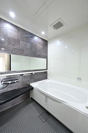 浴室は最新設備に変更。手すりは横型のスマートエスコートバー※1を採用し上質なデザインかつさりげない入浴のサポートも。浴槽を黒にすると湯垢が目立つのであえて白をセレクト。落ち着いた印象にしました。