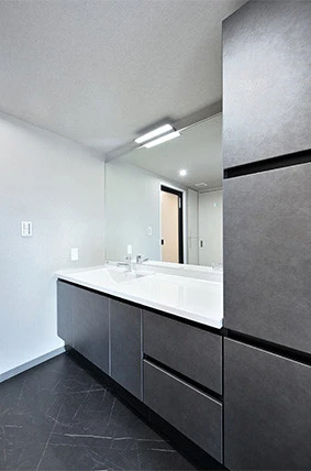 ホテルのような優雅な洗面空間にするために、Tさまお好みの一面鏡とボウル一体型カウンターのシンプルな洗面台を採用しました。また、トールキャビネットと組み合わせ収納量を確保しました。