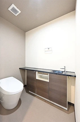 トイレは最新のタンクレストイレを採用し新たに手洗い器を設置しました。トイレの背面と天井のアクセントクロスを同色にして繋がりを出す事で広く感じるトイレ空間を演出。