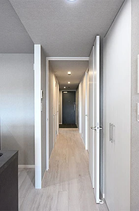 一人暮らしに合わせた広々とした間取りと、落ち着いた内装デザインのお部屋にしたい、とこれまで賃貸に出していた築17年のマンションのリフォームをご要望されました。住まいの顔となる玄関を広く、お手持ちの物を収納しすっきりと暮らしたいというTさまに、収納スペースをたっぷりと確保しながら、開放感のある間取りをご提案。また壁紙の配色や照明の配置など、開放的に感じる工夫を随所に凝らしたホテルライクなお部屋は、非日常を感じる快適な空間になりました。