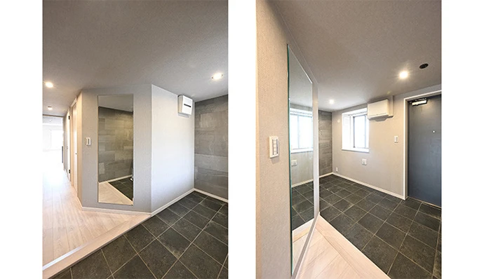 洋室(2)の一部を玄関スペースに変更し土間を広げました。以前は暗く閉鎖的な玄関でしたが、窓からの採光で明るく開放的になりました。姿見を取り付けた壁面は開放感を感じられるように、敢えて斜めに誂え、エコカラット※1と玄関のたたきの濃いグレーがシックな印象に。玄関収納も撤去しこの家を印象付ける大切なポイントとしてデザインしました。