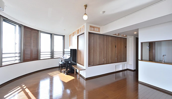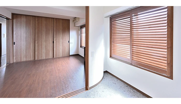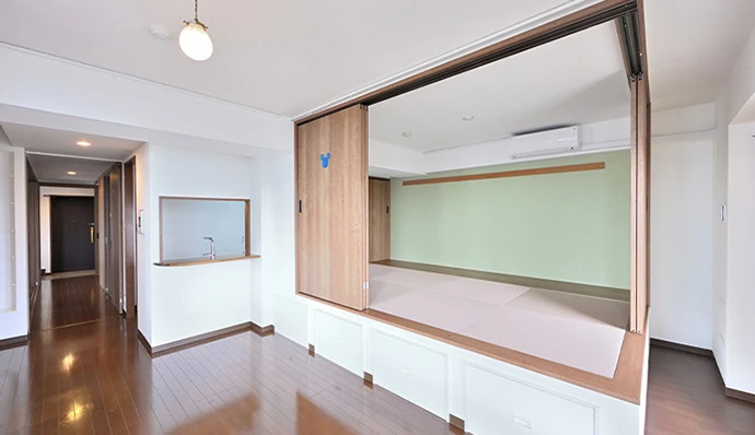 築21年のマンションにお住まいのTさま。ご主人の退職と上のお子さまの独立をきっかけにリフォームを決心されました。「西日による暑さの軽減」「収納スペースを充実させたい」とのご要望から西日対策としてルーバーの設置と小上がりを活用した収納プランをご提案。またゆとりある玄関スペースの確保と、玄関に隣接する洋室を多目的に使えるスペースにしたいとご希望のTさまへ、玄関に土間を新たに設け、間取りを新たにプランしました。収納が充実したゆとりのある住まいが完成しました。