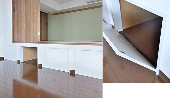畳コーナー(1)の床下収納は、扉を取り外すことができる仕様となっています。部屋数を減らすことにより減ってしまった収納スペースは、床下などを収納空間として利用することで、リフォーム前と変わらない収納容量を確保しました。