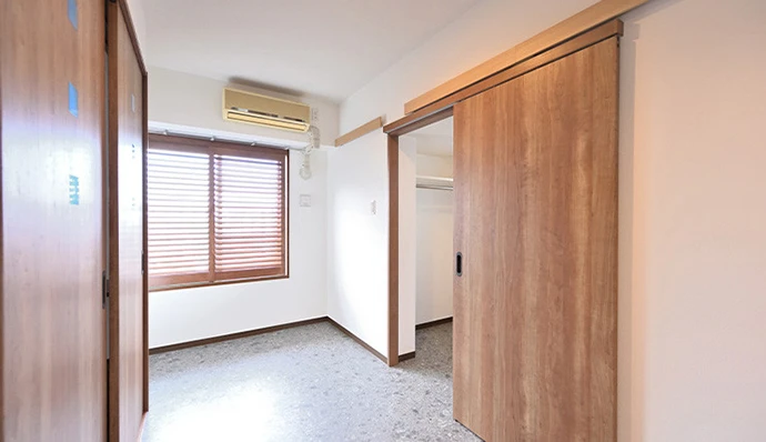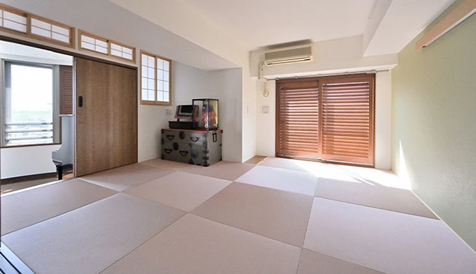 ご夫婦ともに畳のお部屋に慣れているとのことで、洋室のひとつを畳コーナー(2)に変えてご夫婦の寝室としました。リビング・ダイニングと同様に、西日を防ぐルーバーを新設。床下は全面収納空間として利用できます。アクセントクロスには、置き畳の上品な色と引き立て合ううぐいす色を採用しました。