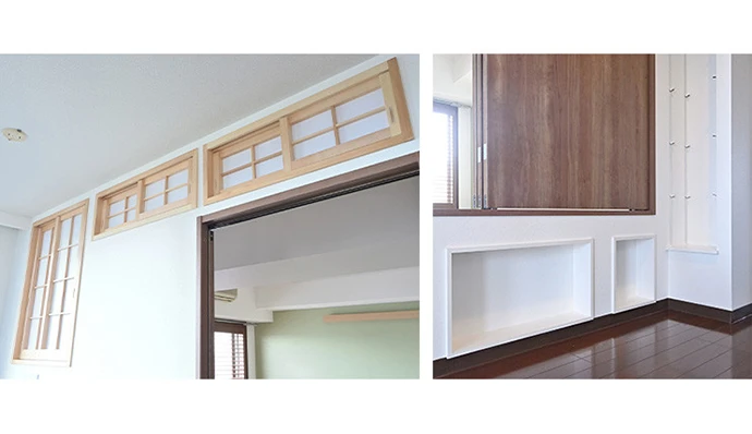 畳コーナー(2)のリビング・ダイニングに面した壁には、引き違いの室内窓を取り付け、就寝時に引き戸を閉めていても換気ができるようにしました。さらに間仕切り近くの壁と柱には、隙間を利用した奥行きの浅い棚と可動式の棚も新設しました。
