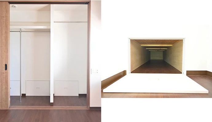洋室のクロゼットの下部は畳コーナー(2)の小上がり収納に繋がる空間を設けました。キャスター付きの収納ケースを利用して、奥深く使うことができます。クロゼットのハンガーパイプは、丈の長いものと短いものを分けてかけられるよう、2種類の高さとしました。