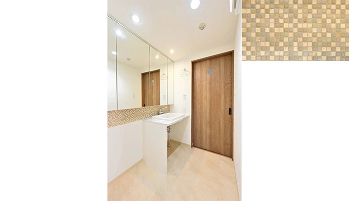 洗面化粧台は、広い2ボウルのものから、1ボウルのコンパクトなものに変更しました。壁には下のお子さまがお気に入りの華やかな色味のタイルを採用。カウンター下部は掃除のしやすくオープンに。将来を踏まえ、座って使用できることも考慮しました。