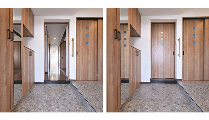 玄関には、季節の飾り物や普段から使う小物を置くカウンターのある玄関収納を新設。玄関からの吹き込みを軽減するため、リビング・ダイニングと廊下の間にある扉を取り外し、代わりに玄関かまち前に引き戸を新たに設置しました。