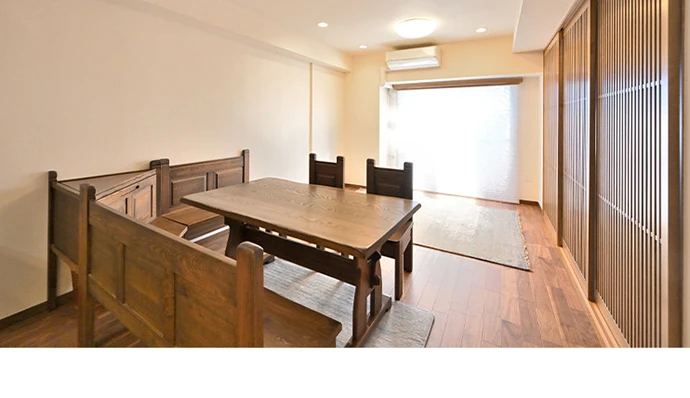 リビング・ダイニングは、お手持ちの重厚な木製家具が映えるよう、白いクロスに張り替え、フローリングは木目を生かした濃いブラウンのものを採用しました。