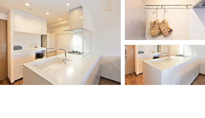 キッチンは、シンクの上にあった吊戸棚や脇にあった壁を取り払って、明るく開放的なオープンキッチンとしました。リビング・ダイニング側は全面がカウンター収納となっており、キッチン背面に造作した食器棚と合わせ、十分な収納スペースを確保しました。また、小物などをさっと掛けられるハンガーレールを、Fさまのご希望で取り付けました。