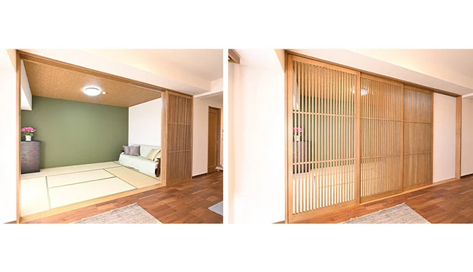 和室は、押入や床の間を撤去し、畳のスペースを拡張。抹茶色のアクセントクロスや天井の木目調クロスといった和を意識したしつらえの中で、ゆったりと寛げるプライベートリビングとしました。格子戸は、木の質感のあるお部屋にしたかったとおっしゃるFさまこだわりのポイント。リビング・ダイニングとゆるやかに仕切り、開け放てば一続きの大きな空間となります。