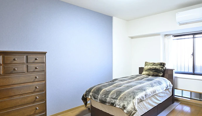 洋室(1)は、寝室にふさわしい、落ち着いた色合いのブルーグレーのアクセントクロスに張り替えました。