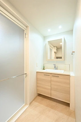 洗面室にも木目調の洗面化粧台、木目のフロアを採用し、木の雰囲気を取り入れました。小ぶりな一面鏡も洗面スペースを可愛らしく演出しています。