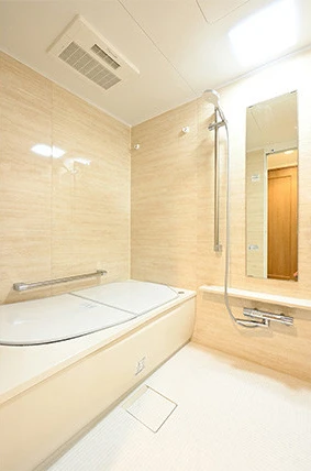 浴室は、ベージュ系のアクセントパネルを四面に採用し、温もりと清潔感の感じられる落ち着いた空間としました。