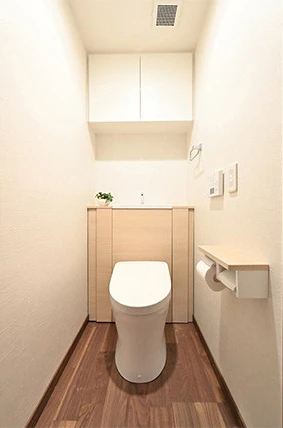トイレは、背面がキャビネット仕様でタンクの見えないタイプを採用。キャビネットには、掃除用具などもしまえるので、すっきりと片付けることができます。