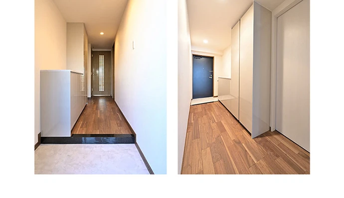 玄関は、下足入れをなくして土間を広げ、さらに、洋室(2)の壁を後退させて廊下の幅を広げることで、開放感を向上させました。廊下には、傘や靴がたっぷりと収納できる玄関収納を設置。新設したトールタイプの収納とともに、収納力アップを実現しました。