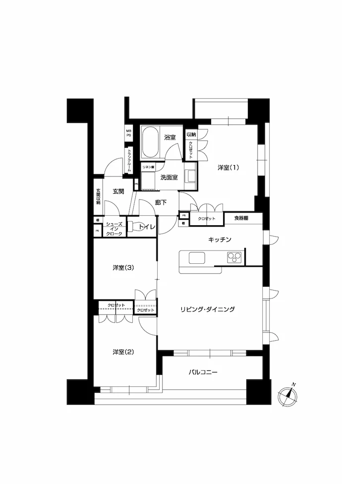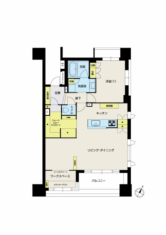 - リビング収納、洋室収納、玄関収納、キッチンカウンター収納、ワークスペース、ウォークスルークロゼット