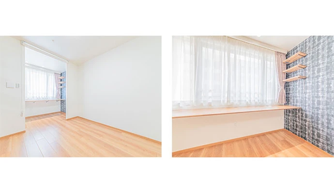 リビング・ダイニングの窓際にワークスペースを設けました。大胆な柄のアクセントクロスがお部屋のポイントになっています。壁面には可動棚を採用し、本や小物を収めることができます。