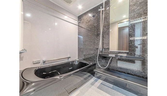 浴室は高級感が感じられるようにブラックを基調としました。ゆっくり寛ぎながら音楽を聴ける機能を追加したことで、こだわりの空間としました。