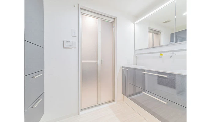 洗面室はすっきりとした空間にするために、三面鏡とボウル一体型カウンターの洗面台を採用しました。また、リネン庫トールキャビネットと面材を合わせることで統一感を持たせました。