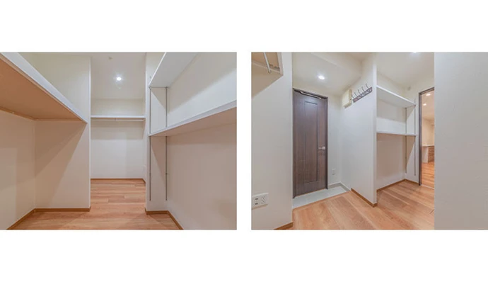 大型のウォークスルークロゼットは布団も収納できる棚を備えました。可動棚により、収納するものに合わせて高さを調整することができます。玄関近くにウォークスルークロゼットを配置し、直接出入りできる動線をつくったことで利便性があがり、帰宅後すぐにハンガーパイプに洋服をかけることも可能になりました。