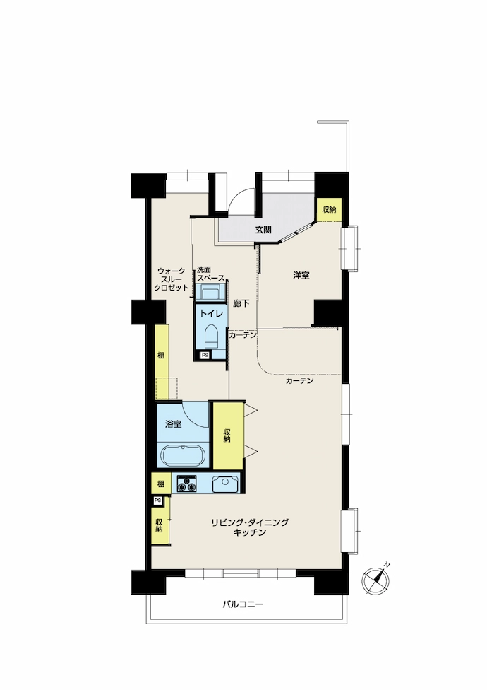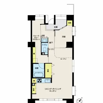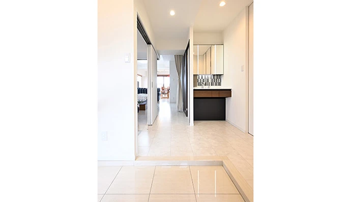 玄関から廊下にかけては、洋室(2)をなくして拡張しました。さらに、廊下とリビング・ダイニングを仕切るカーテンを開けると、玄関からつながる広々とした空間となります。