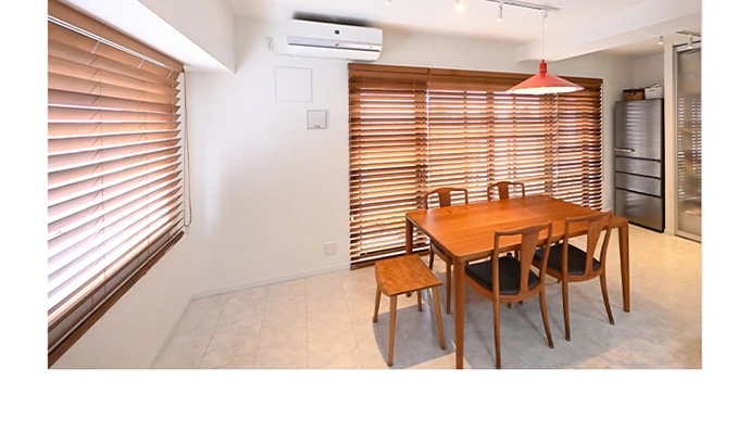 リビング・ダイニングは和室をなくして広げました。これからも長く使えるよう手入れをされたテーブルセットやランプシェードの色合いに合わせ、窓にはウッドブラインドを採用。木の雰囲気に囲まれた暖かみのある空間を演出しました。