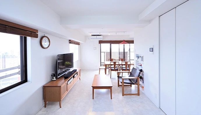 新築で購入された3LDKのマンションにお住まいのAさまご夫妻。お二人での生活であまり使用しない部屋があることから、自分たちのライフスタイルに合わせて、より使いやすい間取りにするために、フルリフォームすることを決意されました。大きなワンルームのように使える広々とした空間にしたいとのご希望をうかがい、引き戸とカーテンを活用してオープンに使える間取りへの変更をご提案。さらに、お二人が動きやすい生活動線と大きな収納を確保し、無駄な空間が少なく暮らしやすいお住まいにすることができました。