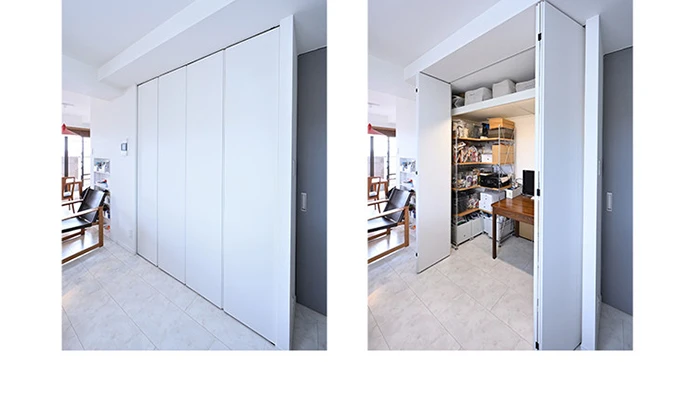 リビング・ダイニングには、大型の収納兼作業スペースを新設。パソコン作業やアイロンがけなどもできるデスクがおさまっており、ご主人さまお気に入りの隠し部屋のような空間としました。