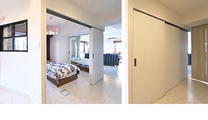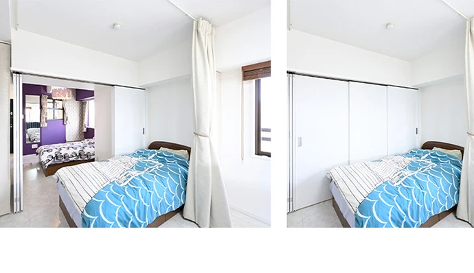 リビング・ダイニングの一角は、ご主人さまのベッドスペースです。リビング・ダイニングとの仕切りは、手軽に開け閉めできるカーテンとし、さらに引き戸を開ければ奥さまの寝室である洋室ともつながります。キッチンからリビング・ダイニング、そして洋室までが一続きとなる、開放感のある空間とすることができます。