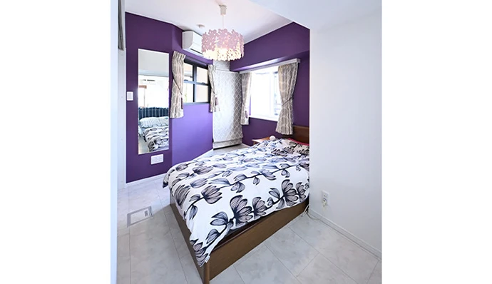 洋室は、奥さまの寝室です。ロールスクリーン付きの造作棚や壁の姿見などによって、奥行きの感じられる空間とし、室内窓を設けることで二面採光と部屋の広がりを確保しました。さらに、お気に入りのピンクのランプシェードに合わせ、紫色のアクセントクロスを大胆に取り入れることで個性を演出。冬場の結露対策として、出窓にはインナーサッシを採用しました。
